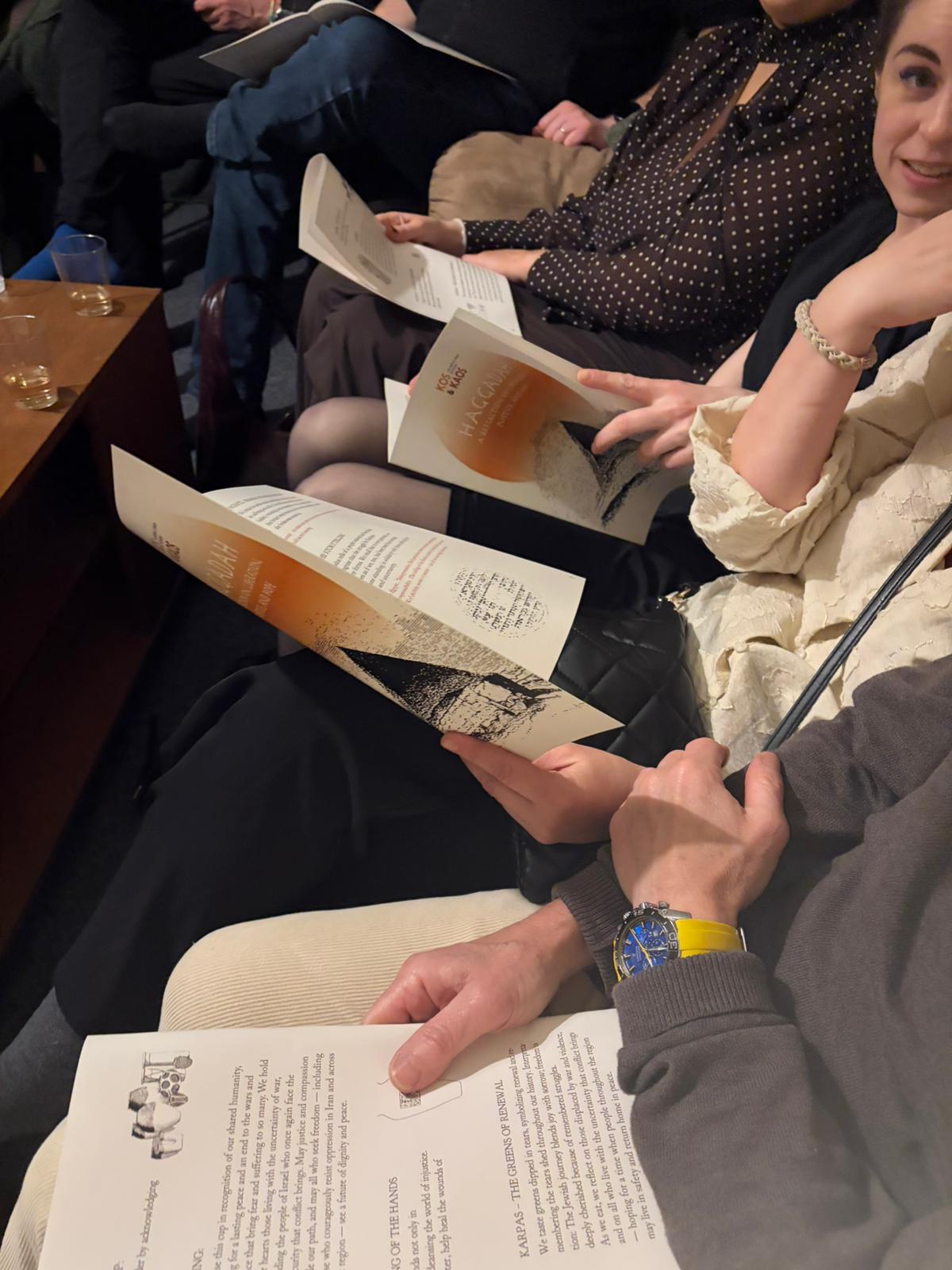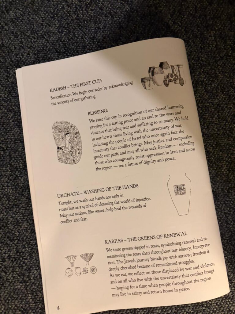 Guests took turns reading passages, offering interpretations and connecting the ancient story to contemporary experiences of freedom, identity and belonging. The room quickly filled with the familiar rhythm of a good seder: texts being passed around, questions raised, wine poured, and conversations unfolding between friends old and new.